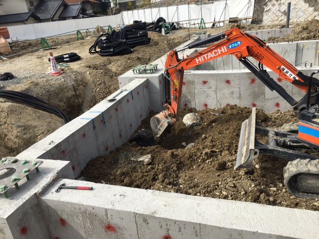 こちらは、ショベルカーで配管を埋めるために掘っている