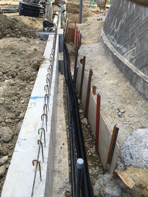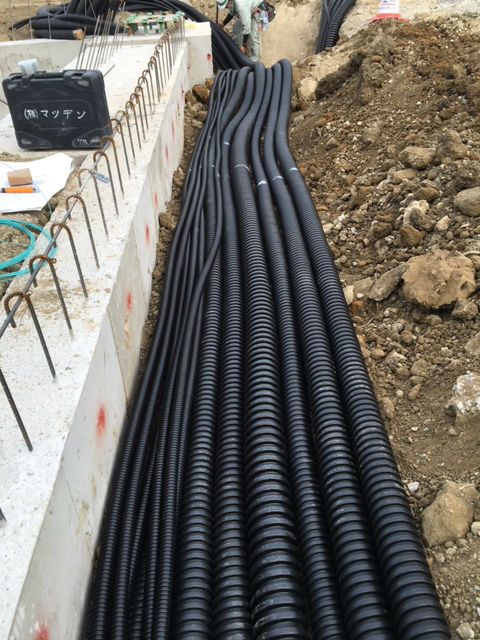 こちらの写真は、地中に電線を通す為に配管を埋めている様子です