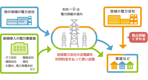 これまで家庭や商店向けの電気は、各地域の電力会社(関西電力や東京電力等)だけが販売しており、家庭や商店では、