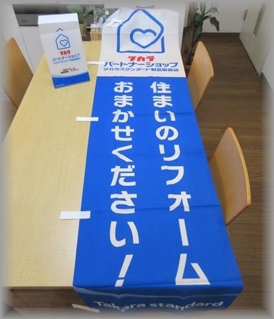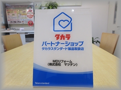 こんにちは!MDリフォームの水口です。当店は高品位ホーローのタカラスタンダード『タカラパートナーショップ』に登録しています。昨日、タカラスタンダードの担当の方に、メンバーズプレートとのぼりを頂きました。