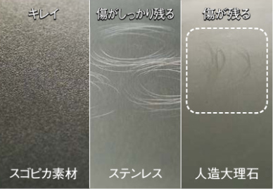 シンクの表面は鉛筆硬度9H底面エンボス仕上げでキズに強くキレイが続きます。