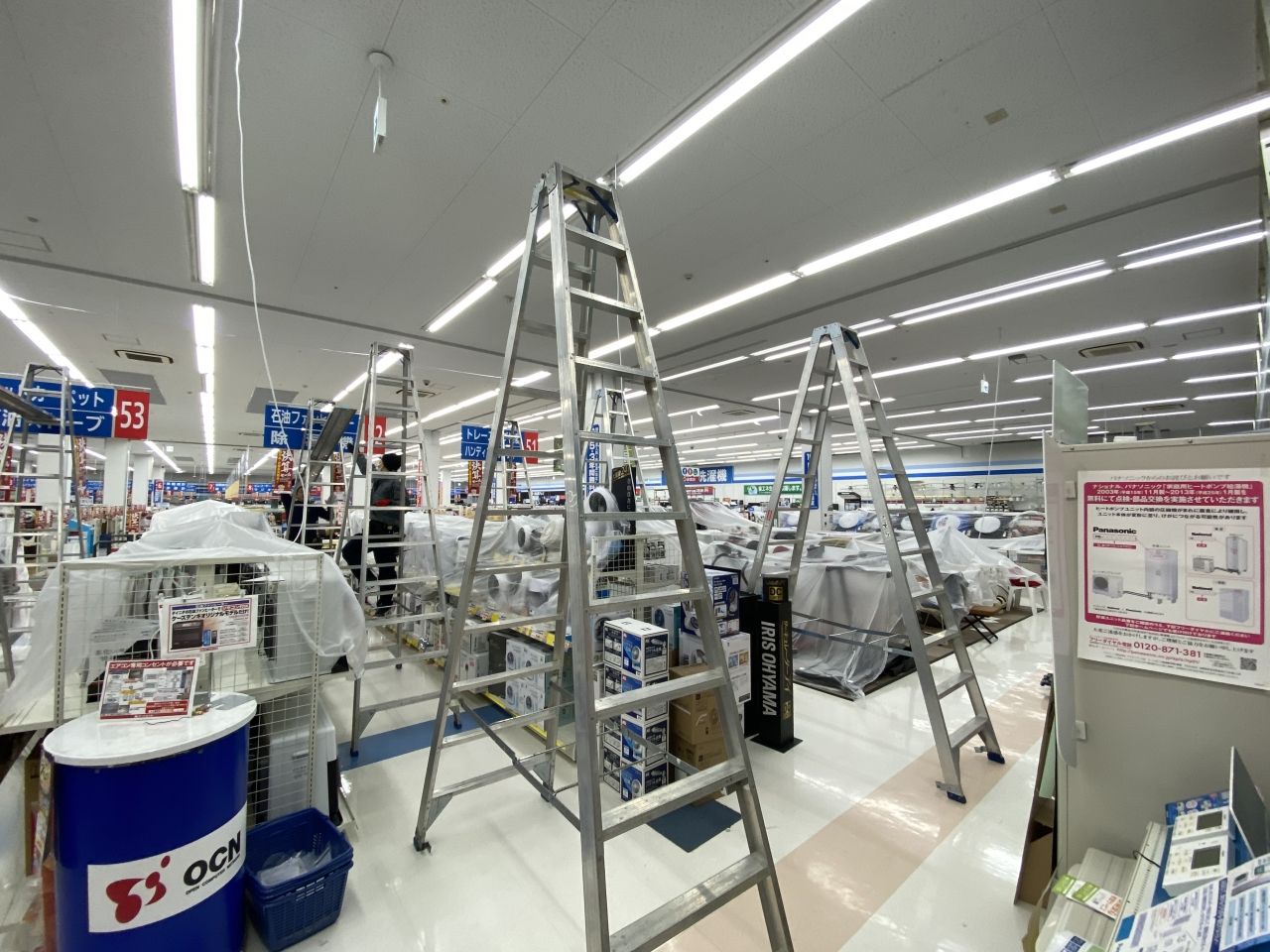 陳列棚の高さや通路の幅も店舗によりけり。今回は養生もしやすい高さで、通路も広かったのでスムーズに作業を進めることが出来ました。