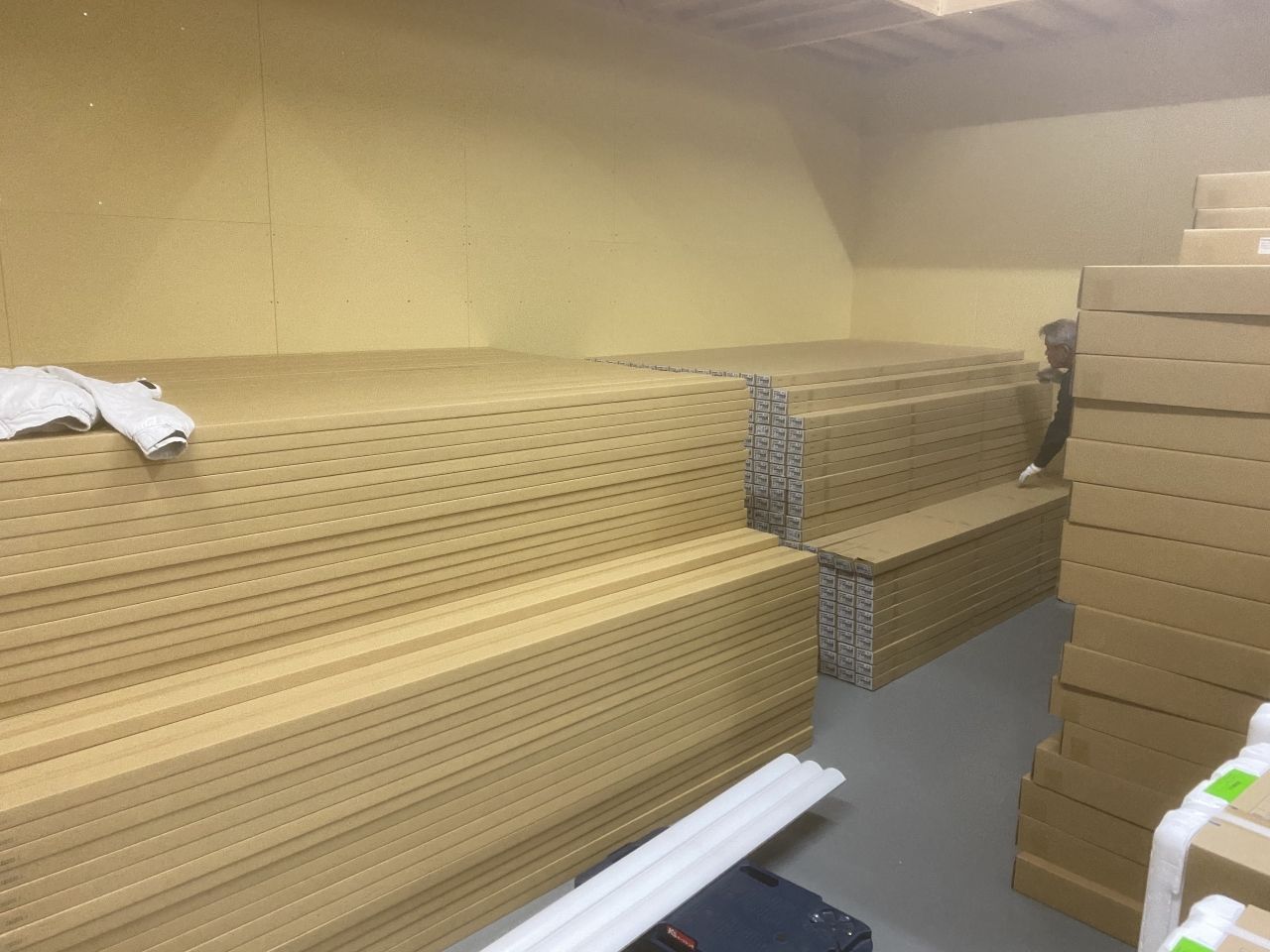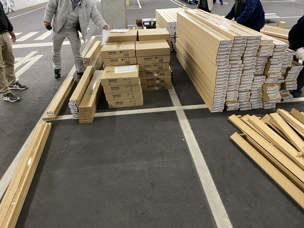 いつもは1度に全て搬入されてくる照明器具も、置き場所の問題もあり、今回は2回に分けて搬入。