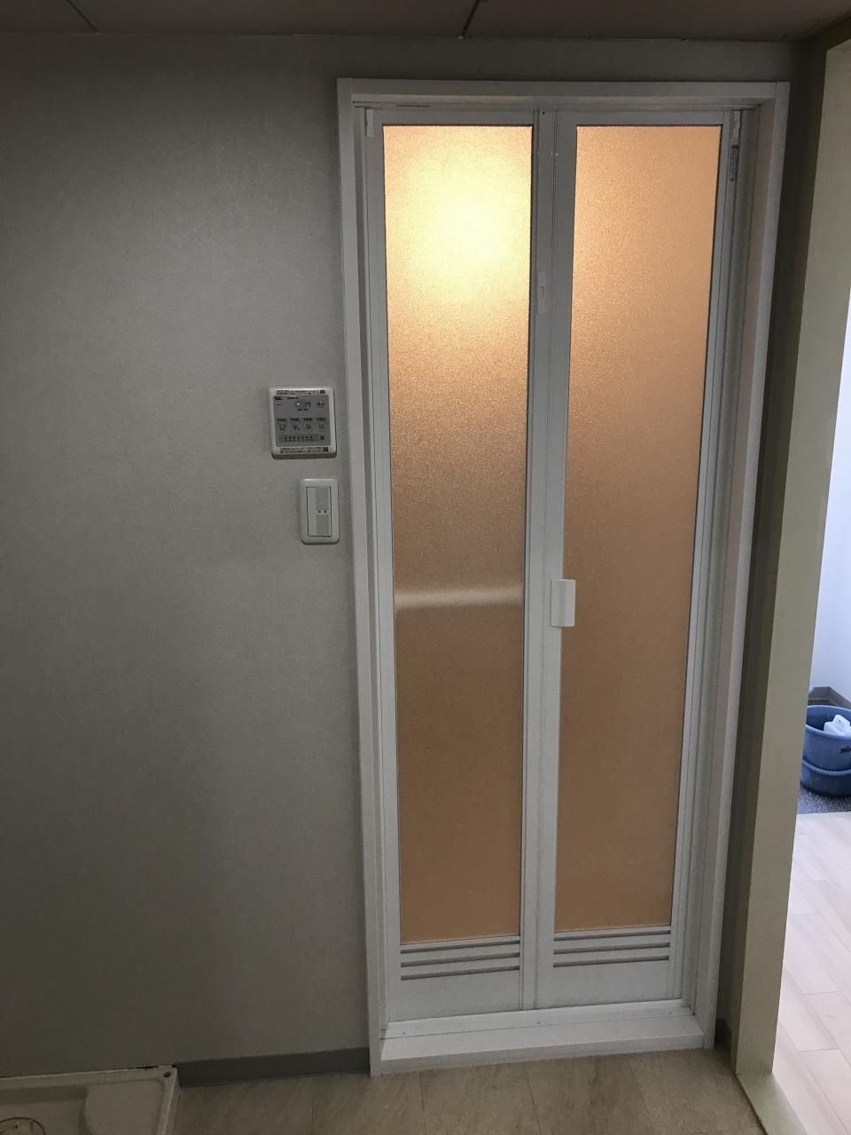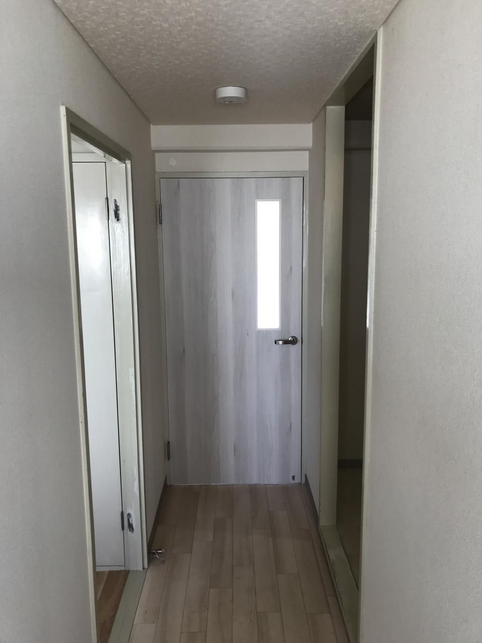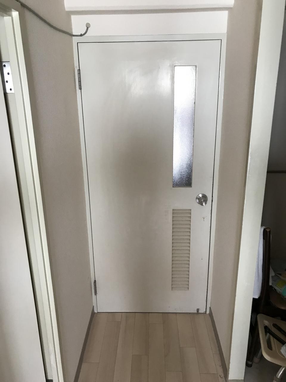 ホール入口の扉も取替。扉柄はトイレのアウトセット引き戸に合わせ、ドアノブも握り玉タイプから握力が弱くても開閉しやすいレバータイプに変更。