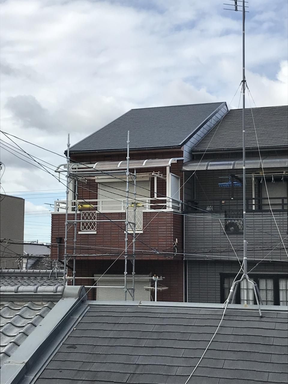 今回のエアコン取付工事は、二階と三階の一部屋は室外機はベランダ置きなので、標準的な工事でしたが、残りの三階の一部屋が室外機を外部の壁に架台を取り付けて、それに乗せる形の工事でした。本来の工事のやり方としてはスライダーという長いはしごをかけて、それに登り取り付けをしますが、今回のお宅はちょうどうちの会社が、外壁のリフォーム工事を施工中でしたので、足場があり安全に作業する事が出来ました。