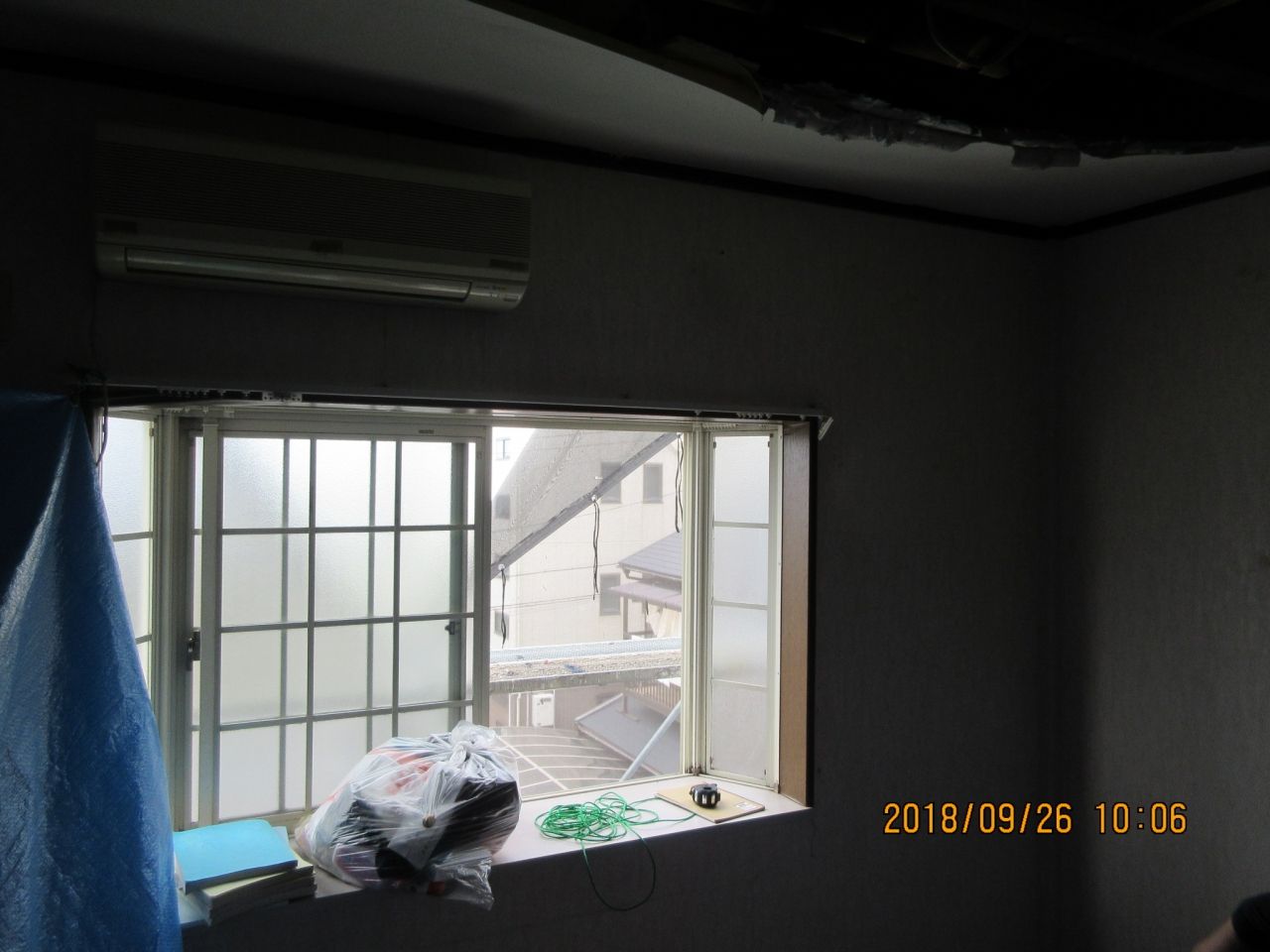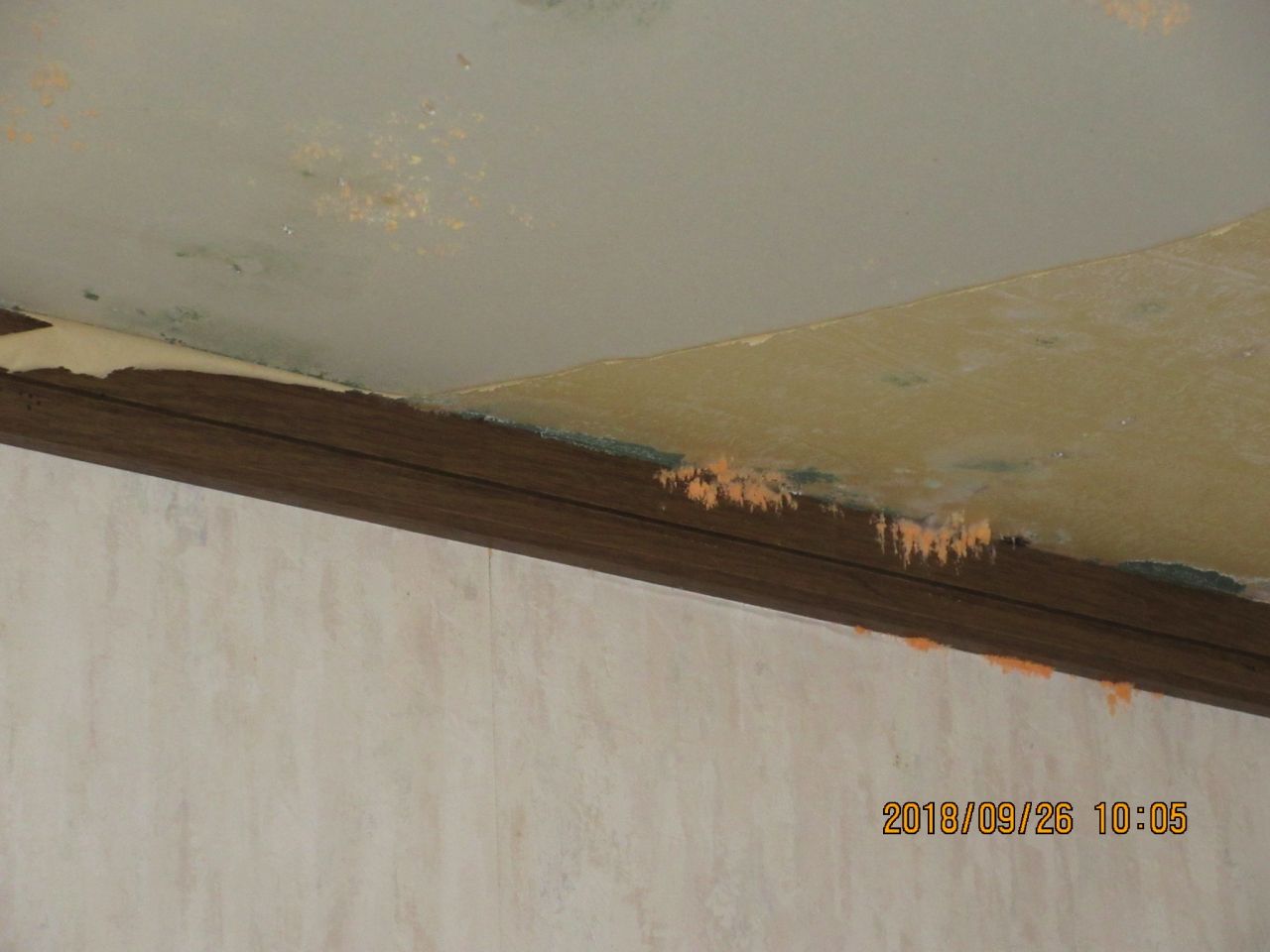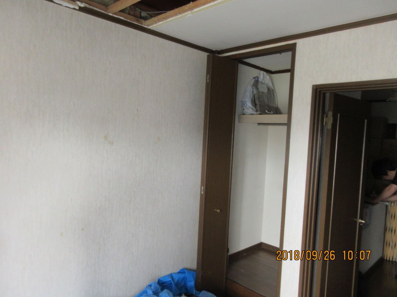 屋根が飛んだ側の部屋は雨水の浸水によりあちらこちらにカビが発生。天井も一部抜け落ちたりし、半改装規模の工事となりました。