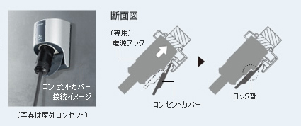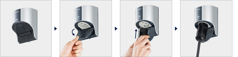 電気自動車の充電ケーブルに求められる抜け防止機能としてコンセントカバーと(専用)電源プラグの突起部が引っかかりロックされる構造です。電源プラグをコンセントに差し込むだけで簡単に接続でき、操作性に優れています。