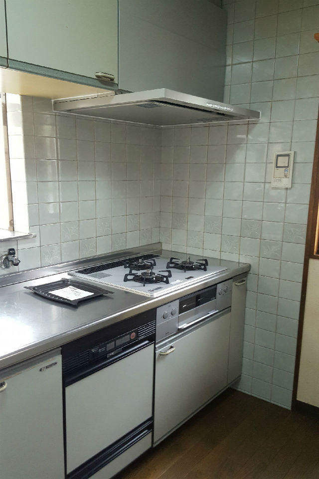 今回はガスコンロとレンジフードもお取替えさせていただきました!コンロは、ノーリツピアット『ラックリーナ』ワイドグリルとオート温め機能、連続オートグリル。トッププレートはもちろん、お手入れカンタン。レンジフードは、ノーリツ スリム型ノンフィルター『クララ』普段のお掃除はフラットな整流板を拭くだけ。そしてコンロと連動します。