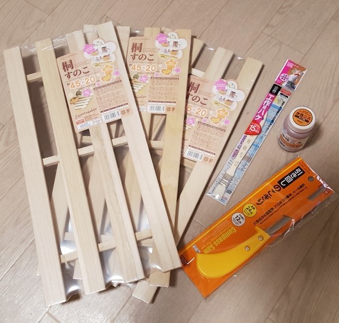すのこは好みのサイズにカットして木工用ボンドで貼り付け、ニスを塗って仕上げました♪
