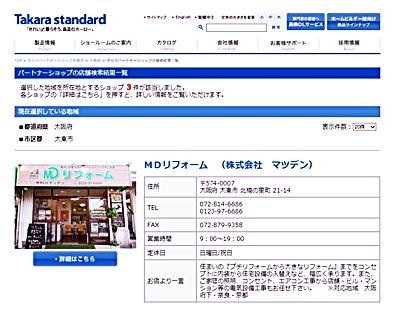 タカラスタンダードのWebサイトでタカラパートナーショップを探すのバナーから大東市で検索した時の画面です。