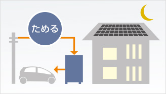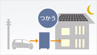 電気代の安い夜間に電気をEVにためて昼間に使うことで電気代を節約。電気のひっ迫期に買電を抑制することでエネルギーのピークシフトにも貢献。