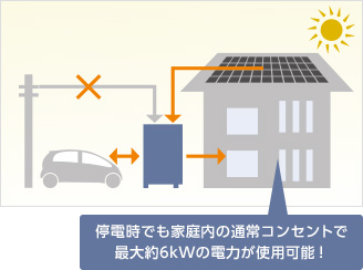 EVにためた電気が生活をバックアップ。太陽が照っていればPVからEVへ再充電可能。停電時でも家庭内の通常コンセントでいつもと同じ電化製品が使用可能。