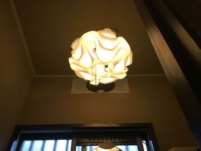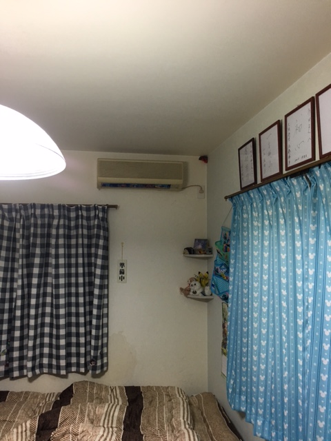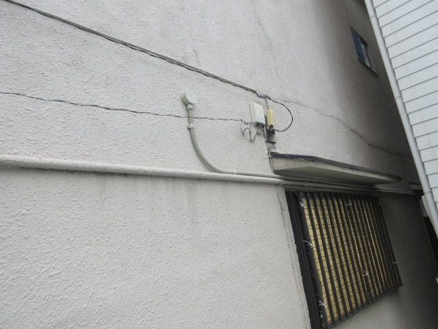 2階の奥の部屋に取付られていたエアコン。既存ブレーカーに空きがあったので、「配線とコンセントの取付工事だけで済みそうやな」と思いながら、吉田の顔を見ると少し渋い顔。理由を尋ねると、配線をどこから2階へもっていこうかと。「室内で階段つたいに2階へもっていけばいいのでは?」と浅はかな考えをしていた自分とは違い、「壁を貫通させ、屋外から2階へもって行きましょう」と頼もしい提案。ごくごく当たり前の方法なのかもしれませんが、まだまだ勉強不足な自分からしたら、初めて見た現場でそれも短時間でお施主様はもちろん、工事する側もムダのない最善の方法で施工出来るよう考え、提案できるって凄いなと改めて思いました。