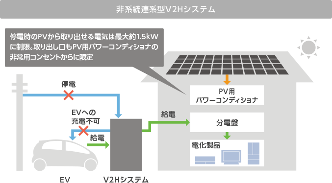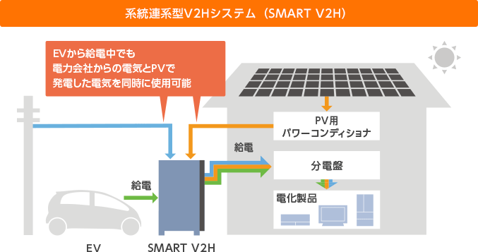 EVにためた電気が生活をバックアップ。太陽が照っていればPVからEVへ再充電可能。停電時でも家庭内の通常コンセントでいつもと同じ電化製品が使用可能。