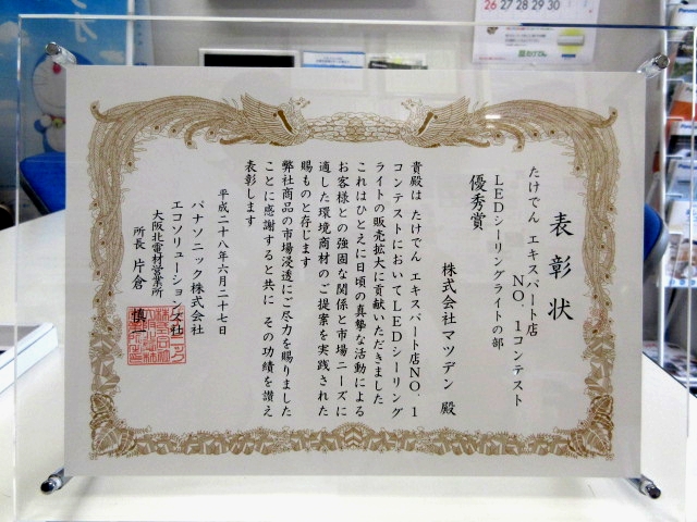 こんにちは。MDリフォームの水口です。取引先の株式会社たけでんさんでエキスパート店No1コンテストがありLEDシーリングライト部門で『優秀賞』をいただきました!記念すべき第1回目のコンテストでこのような賞をいただけて社員一同、大変喜んでいます。これを励みに、これからもより一層、精進してまいります。皆さま宜しくお願いいたします。
