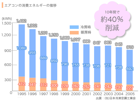 エアコンのエネルギー消費量は1995年から2005年までで40%も減少してるっていうことには、かなり安くなってると思いそうですが、実はそうでもないんですよねぇ