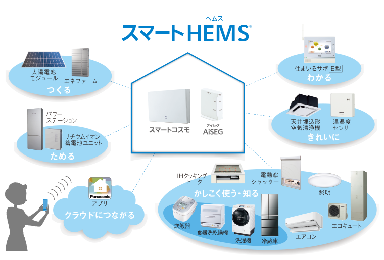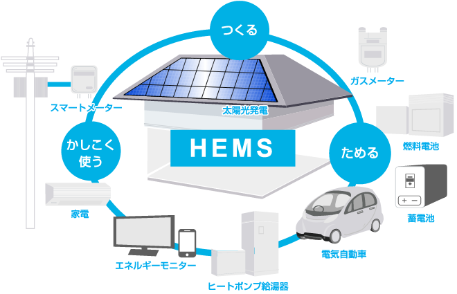 「HEMS」は、そこからさらに一歩進んで、家中のこれら家電製品や他のエネルギーを使用する製品を、住宅全体として管理して「表示」し「制御」しようという取り組みなのです。